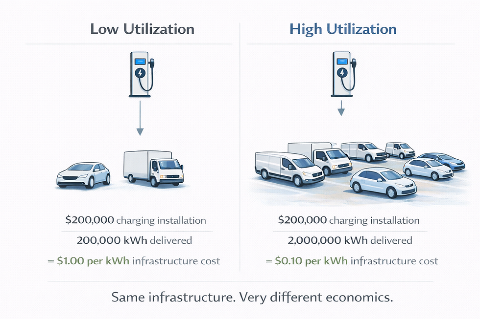 When a charger serves more vehicles, or operates for more hours each day, its fixed costs are spread across more energy delivered. The cost per kWh falls. When a charger sits idle much of the time, those same costs are spread across far fewer kWh, making each unit of energy effectively more expensive.
