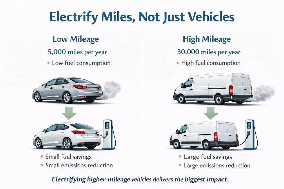 The same principle applies to emissions reduction. A vehicle that drives 30,000 miles per year produces far more emissions than one that drives 5,000 miles per year. Electrifying the higher-mileage vehicle displaces far more gasoline or diesel.