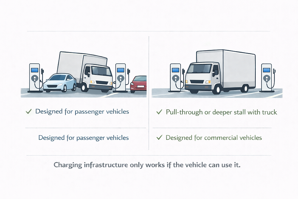 The charger itself may work perfectly. But if the vehicle can’t park there, the charger might as well not exist. For passenger EV drivers, this is mostly an inconvenience. They can drive around and look for another station.